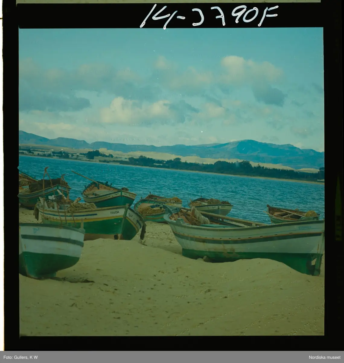 2791 Tunisien Kartago. Målade båtar på strand, vy över bergigt landskap.