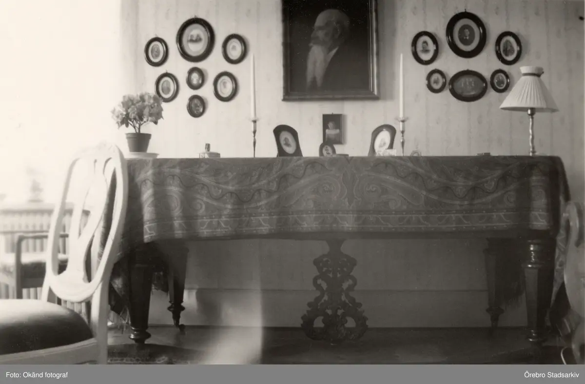 Familjeporträtt ovanför bord med stor duk på Pettersbergs gård, 1930-tal