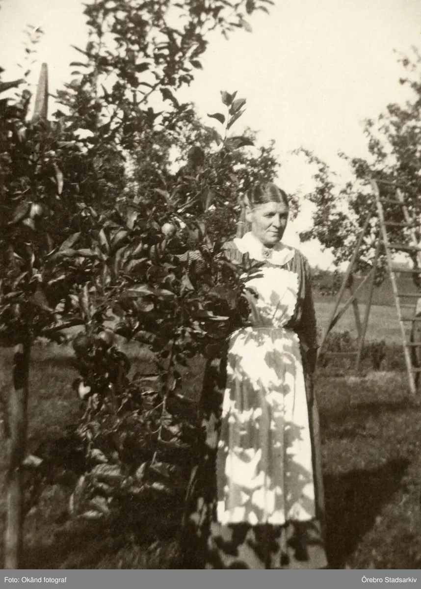 Husfrun bland fruktträden på Pettersbergs gård. 1919