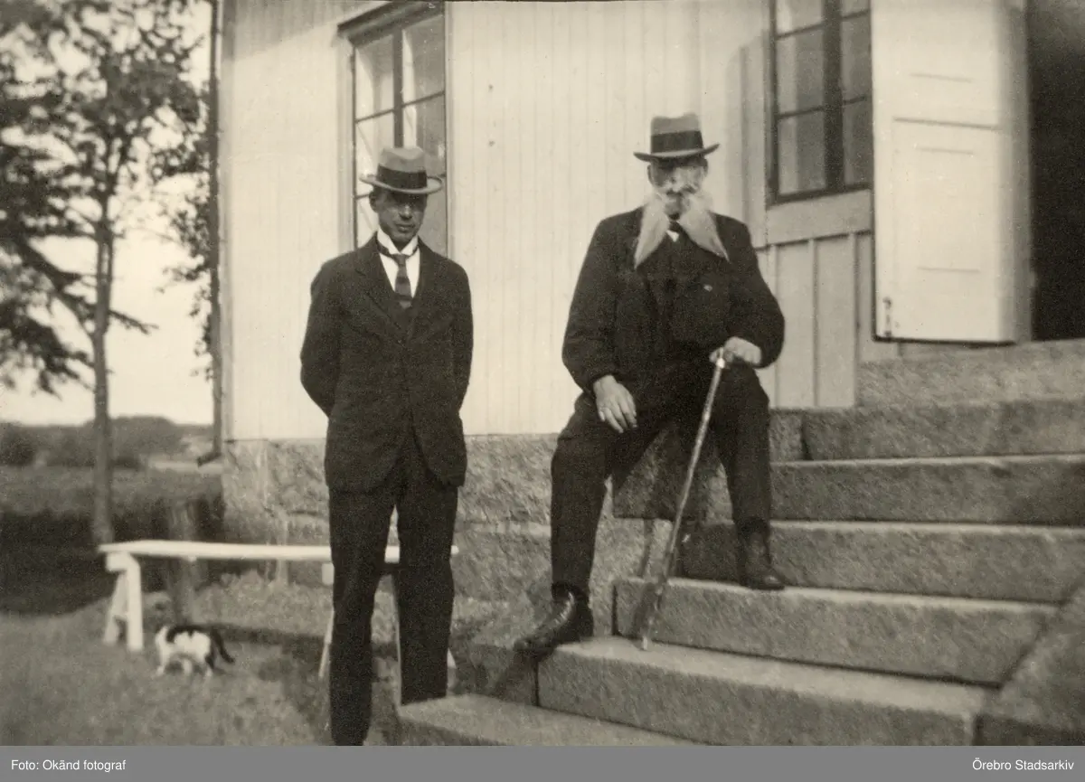 Far och son på trappan till Pettersbergs gård, 1920