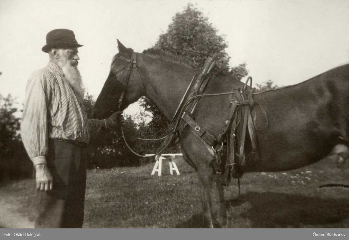 Husbonden håller en selad häst på Pettersbergs gård, 1919