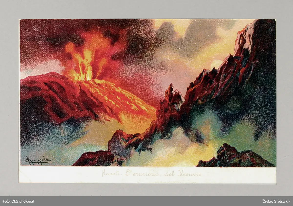 Vykortet illustrerar utbrott från vulkanen Vesuvius, 1913