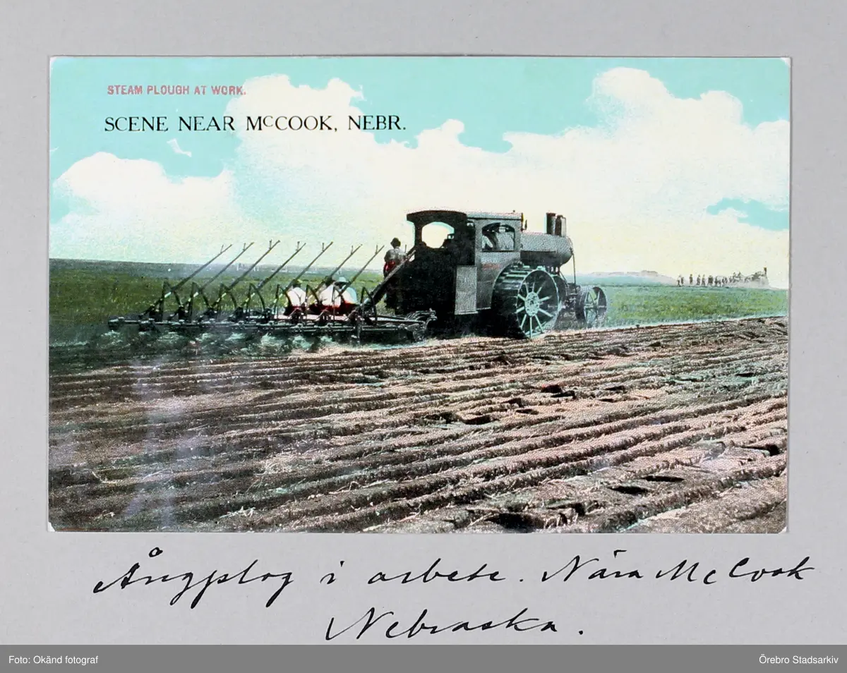 Vykort på ångdriven plog på åker i närheten av McCook i Nebraska, 1913