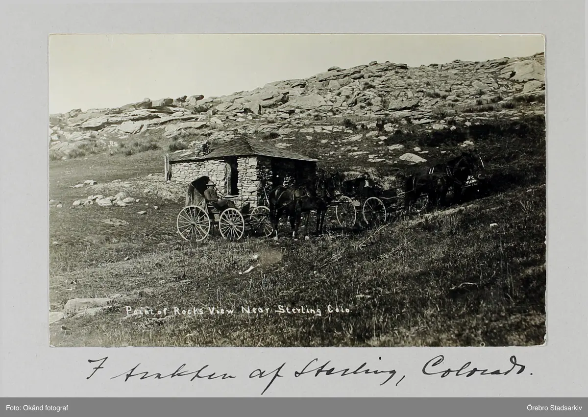 Vykort på stenhus och två hästdragna kärror i Sterling i Colorado, 1913