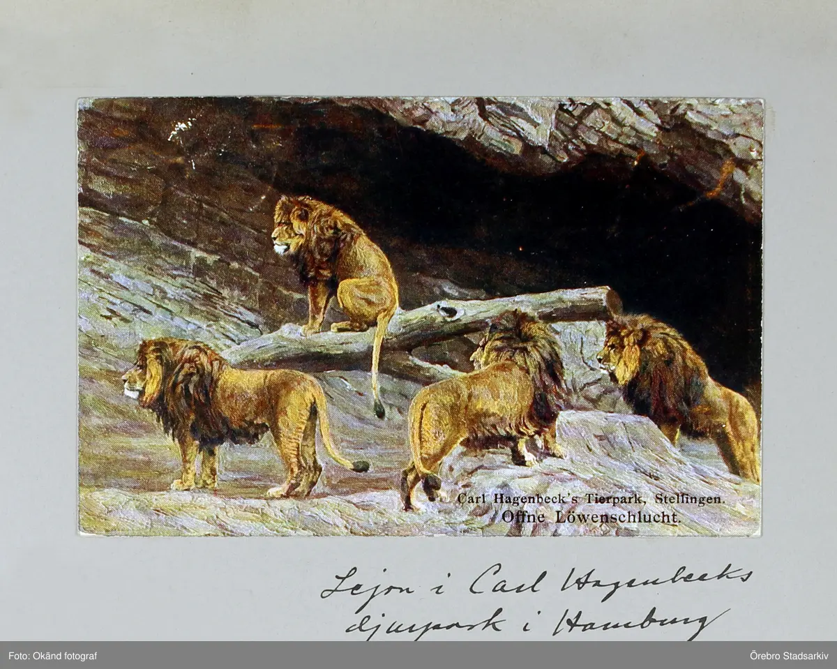 Vykort på fyra lejonhannar i Carl Hagenbecks djurpark i Hamburg, 1913