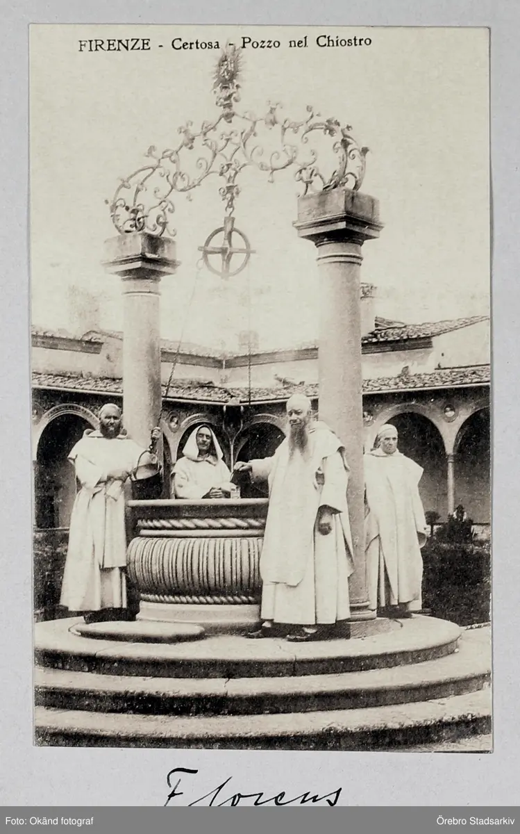 Vykortet visar klosterbrunnen med fyra närvarande munkar, 1913