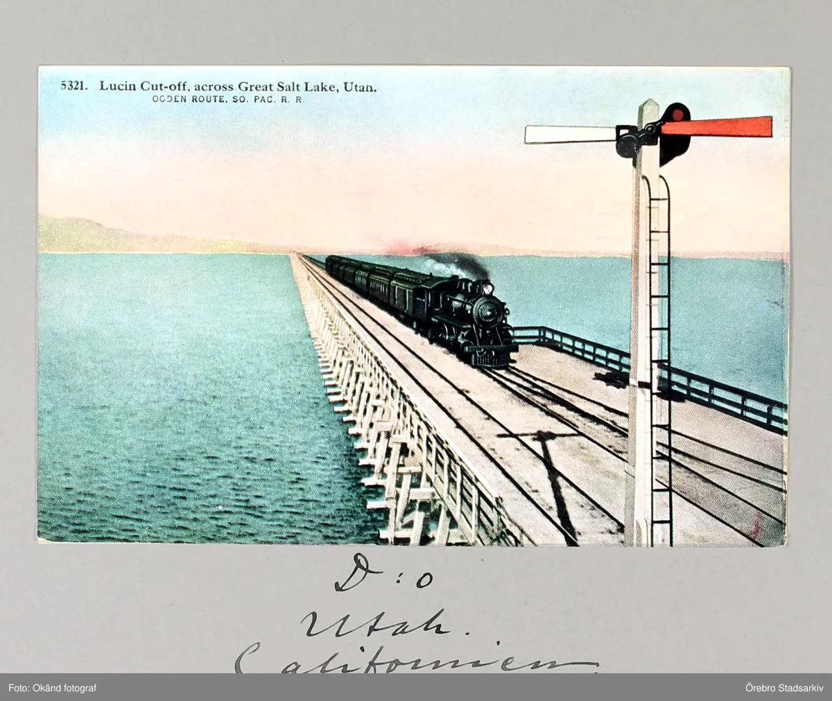 Vykort som visar järnvägsbanan genom Salt Lake sjön, 1913