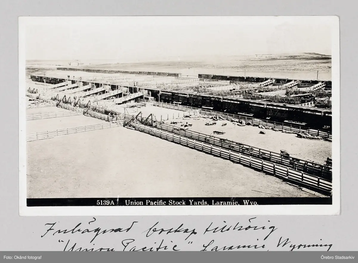 Vykort på boskapsinhängnad tillhörig Union Pacific i Laramie i Wyoming, 1913