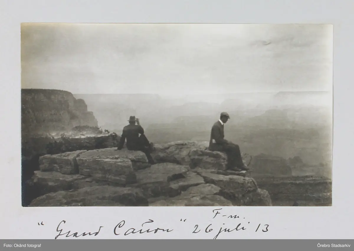 Erik Fernström vilar på en klippavsats utblickandes på Grand Canyon, 1913-07-26