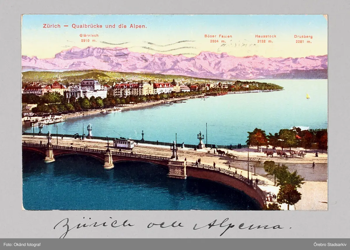 Vykort som ger en översiktsbild på Zürich med Alperna i bakgrunden, 1913
