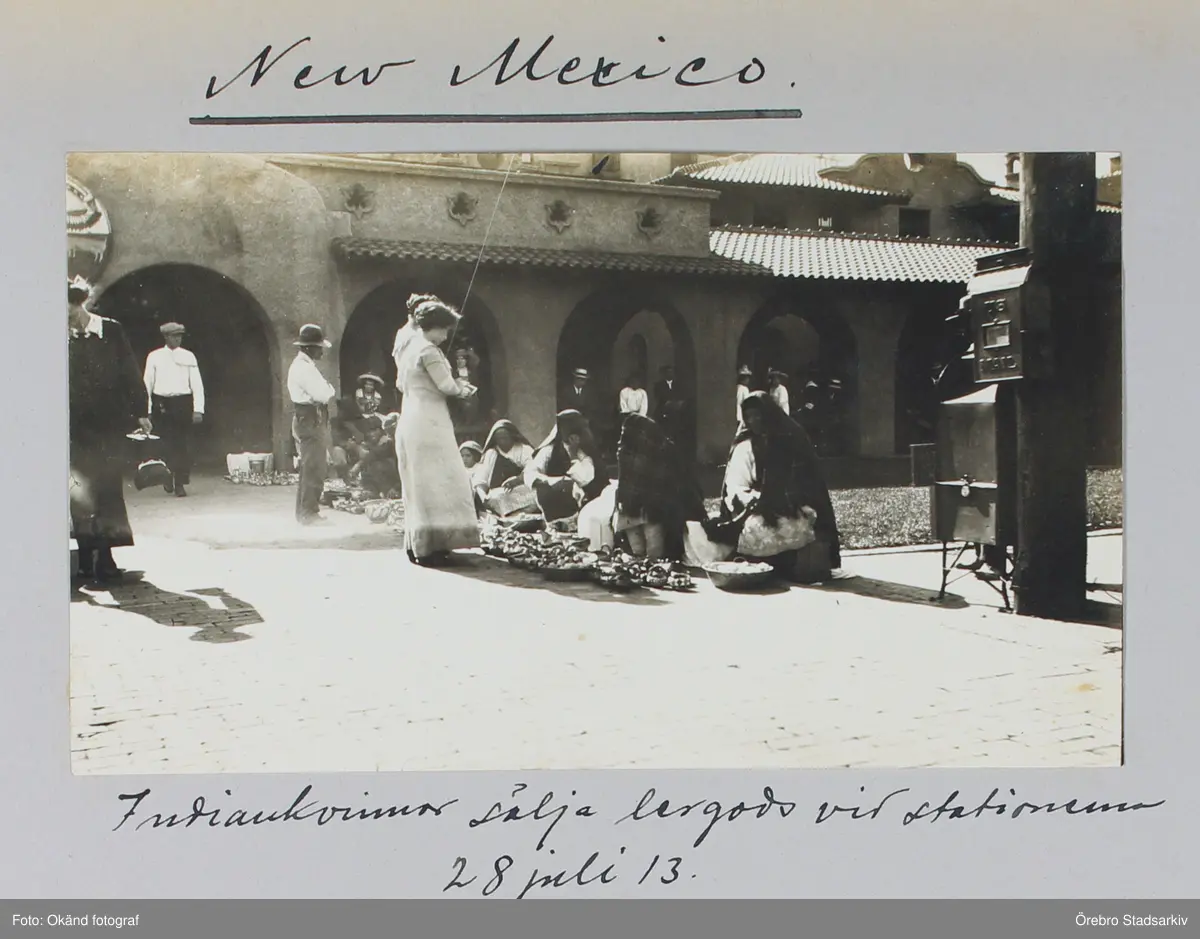 Indiankvinnor säljer lergods vid en station i New Mexico, 1913-07-28