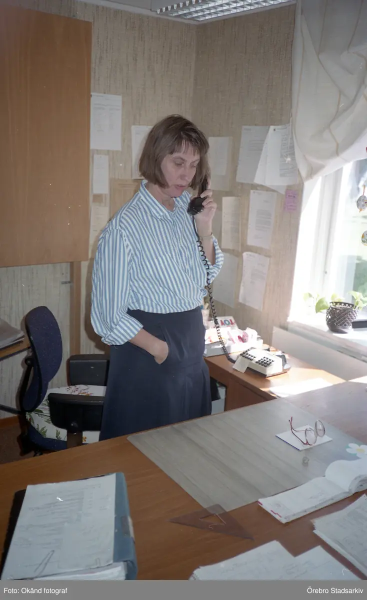 Kvinna talar i telefon vid skrivbord i Tysslinge, 1990