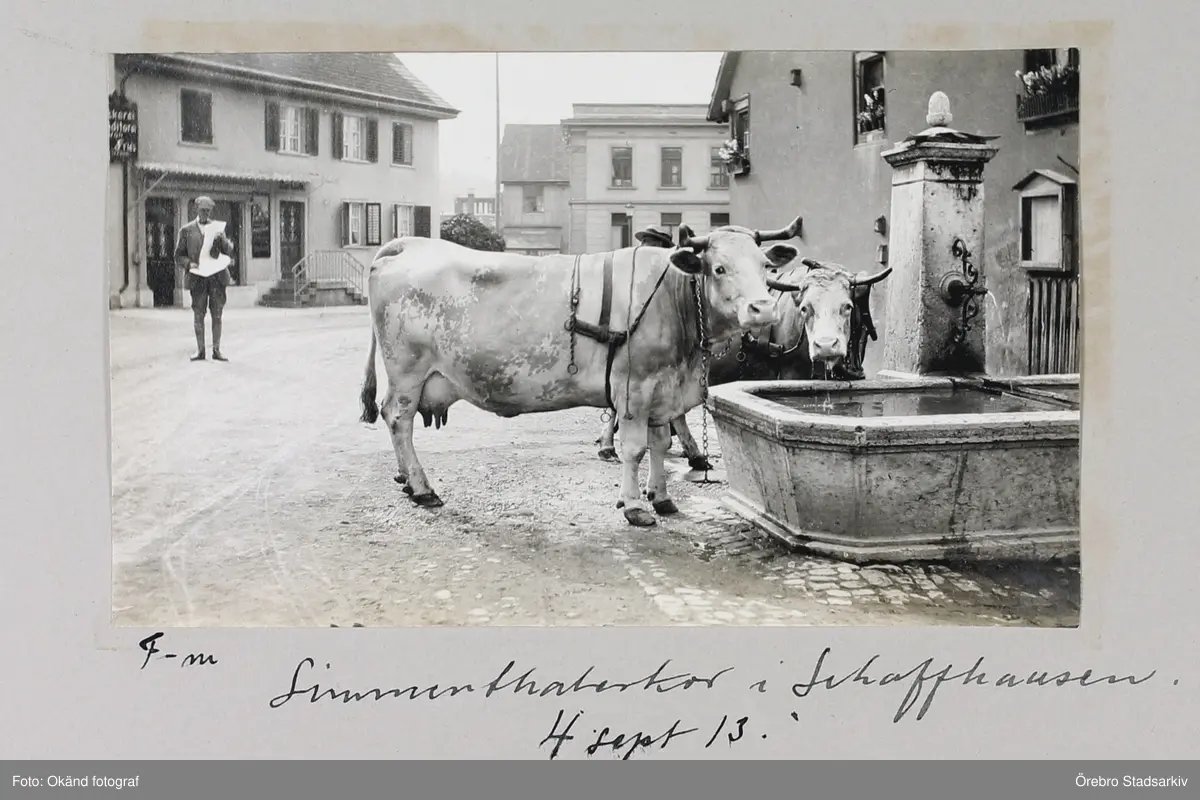 Simmenthalerkor dricker vatten ur brunnskaret i Schaffhausen i Schweiz, 1913-09-04