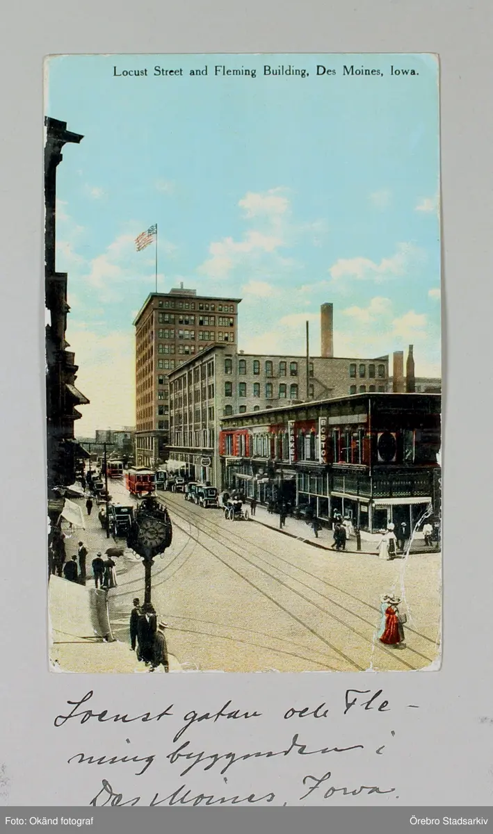 Vykort över Locust Street och Fleming Building i Des Moines i Iowa, 1913