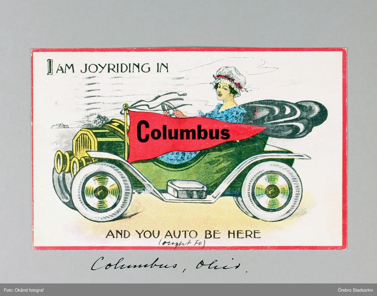 Färgglatt vykort på kvinna som kör bil i Columbus i Ohio, 1913