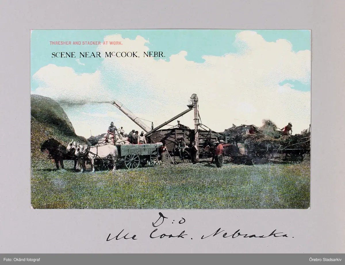 Vykort på ångdrivna tröskverk och arbetare i McCook i Nebraska, 1913