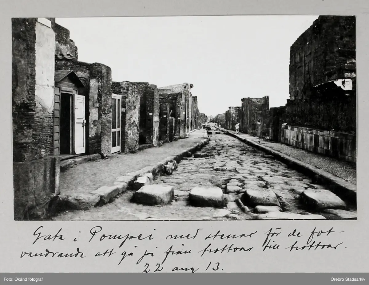 Gata i Pompeji med fotstenar för att gå från trottoar till trottoar och slippa trampa i träcket, 1913-08-22