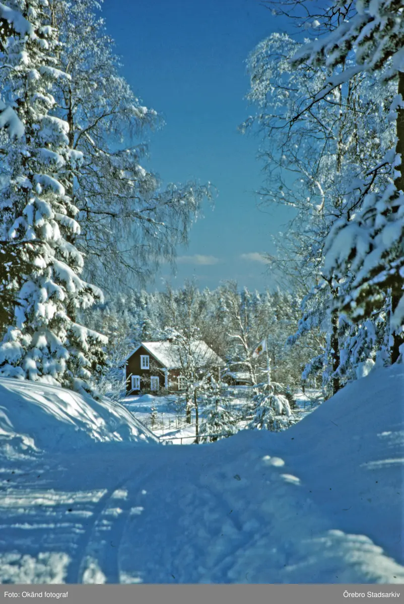 Vinterlandskap med stuga i bakgrunden vid Ånnaboda, februari 1994