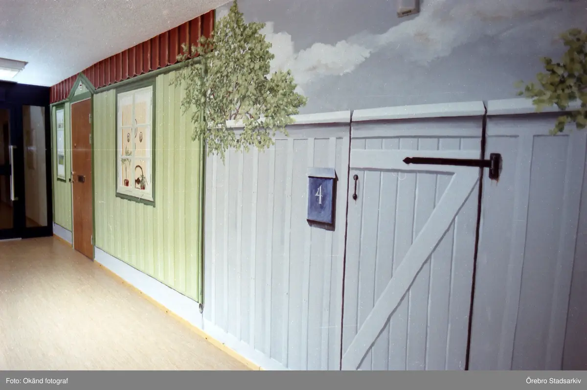 Väggmålning av hus med staket på äldreboendet Sofiagården, 1980-tal