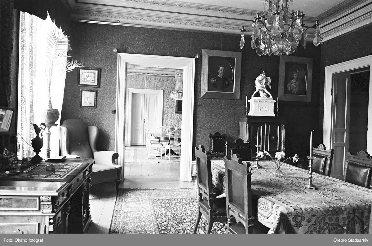Skrivbord och kristallkrona över matbord i Karlslunds herrgård, 1981
