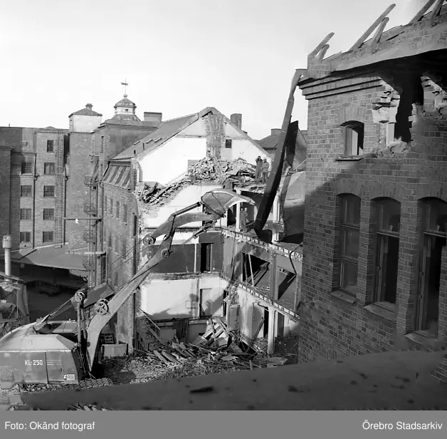 Från grannfastigheten ser man grävskopans rivningslusta på Fredsgatan 4, 1970-tal