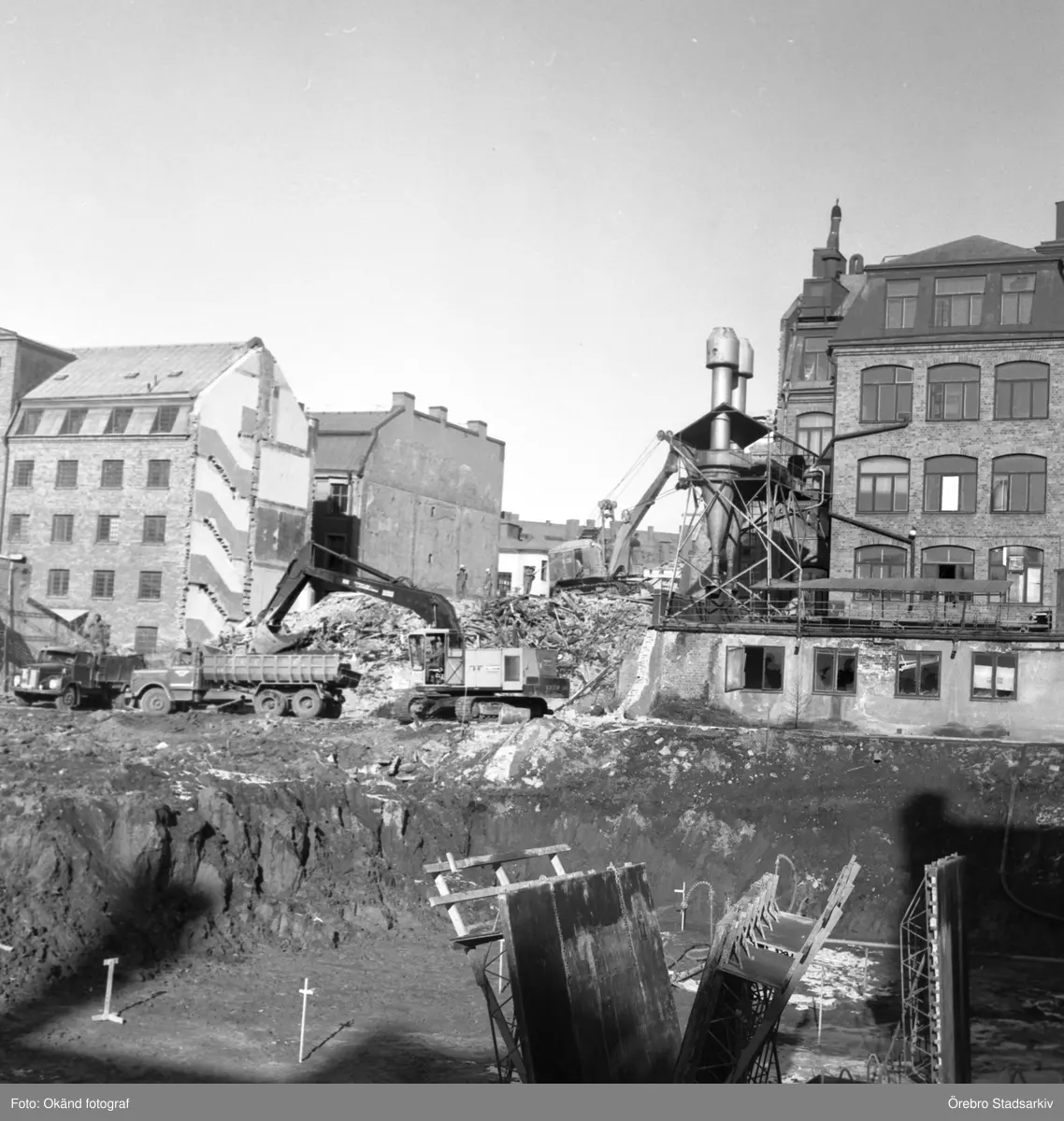 Lastbilar hämtar rivningsmassa på Fredsgatan 4, 1970-tal