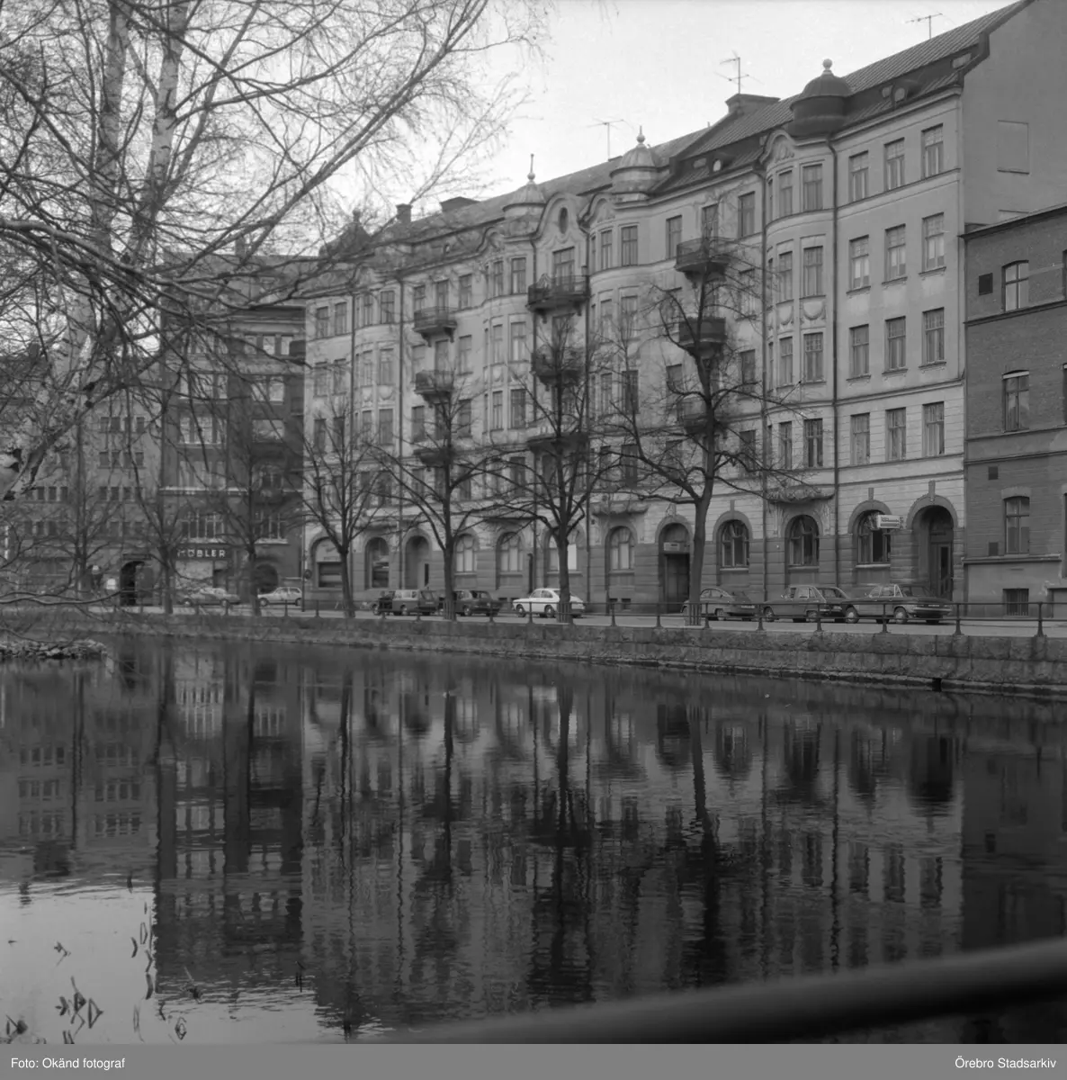 Speglingar av fastigheterna längst Norra strandgatan syns i Svartån, 1970-tal