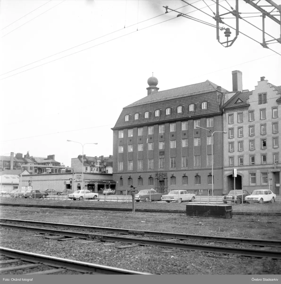 Över järnvägsspåren ses fastigheterna på Östra Bangatan, 1970-tal