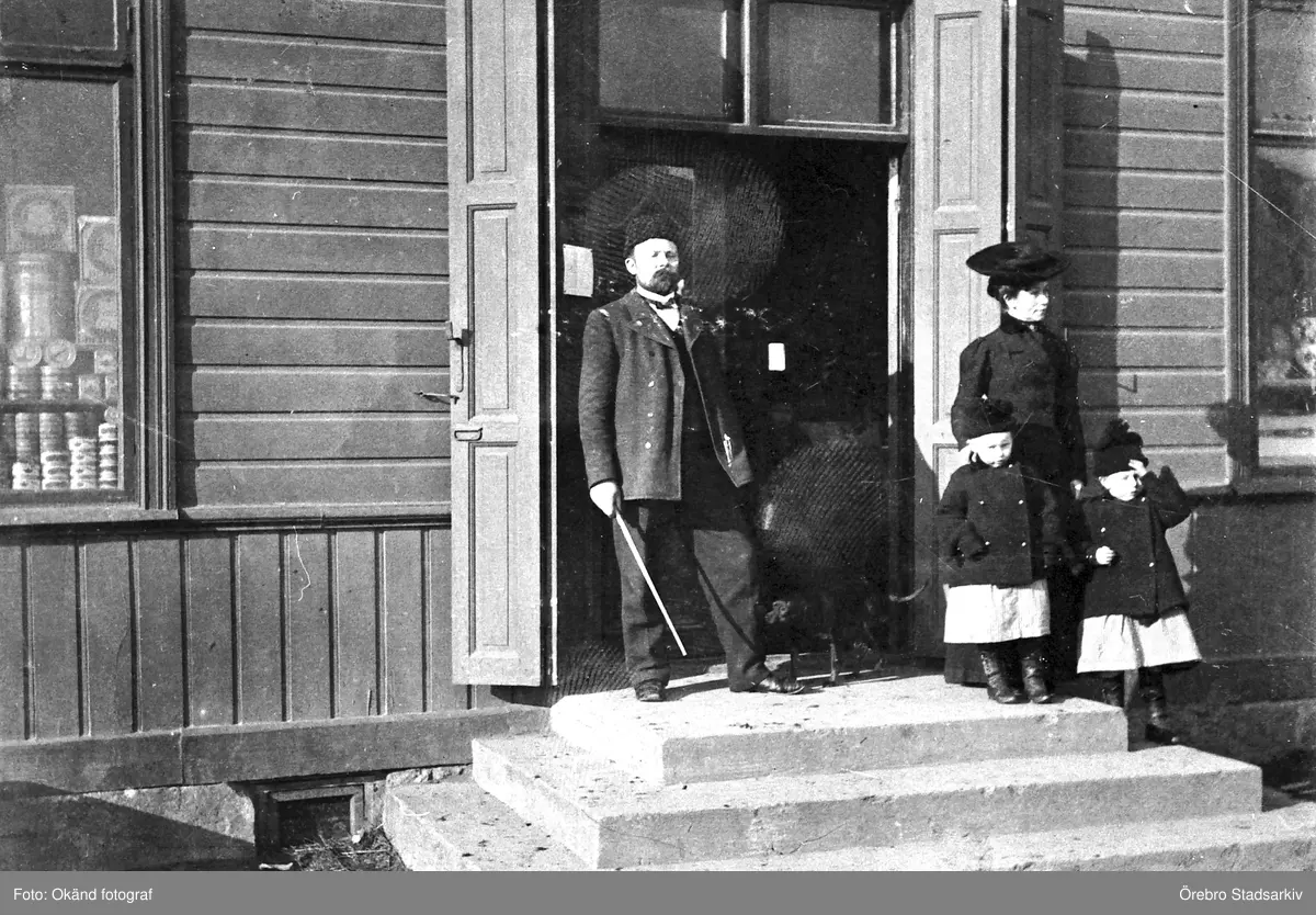 Handlare Hagberg med familj på trappan till sin affär i Knista, omkring 1905