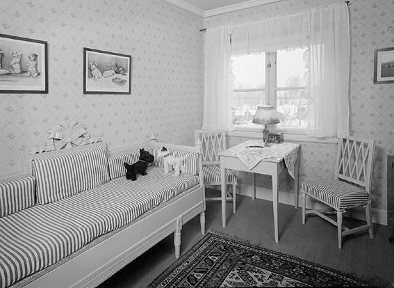 Interiör från bostad. Rum möblerat med bord, stolar och soffa.