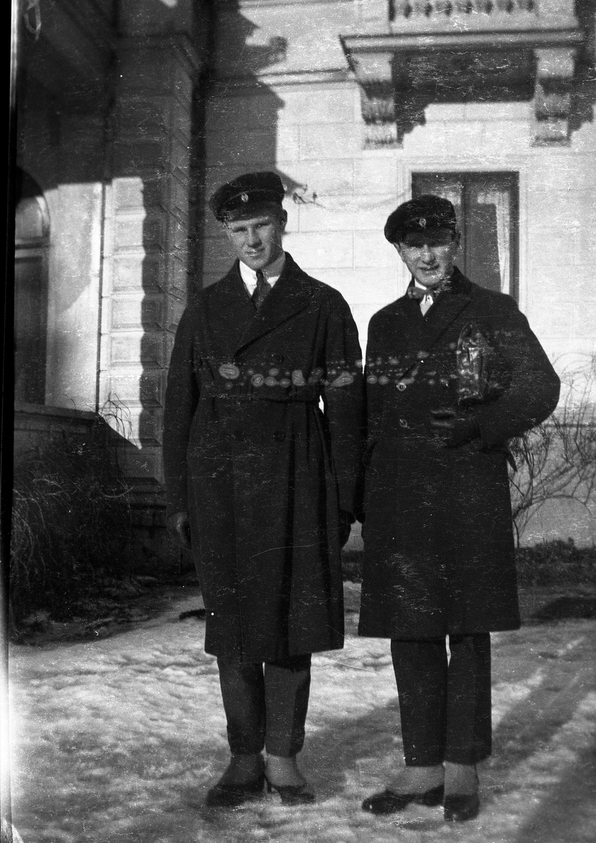 Två yngre män framför stenbyggnad. Mannen till höger troligtvis Georg Sundling.