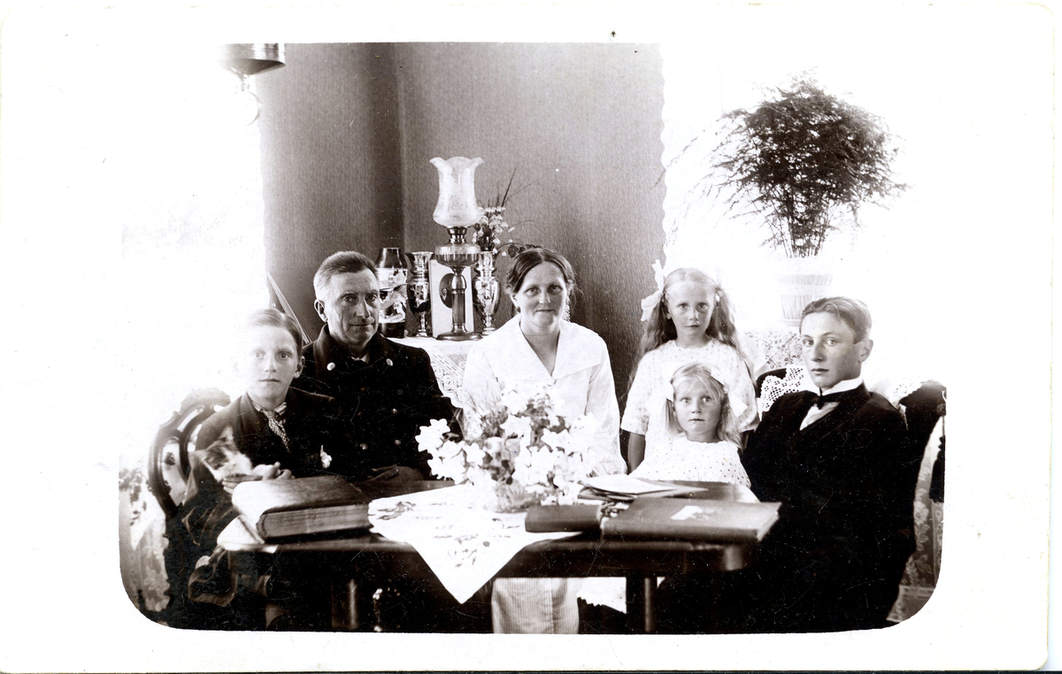 Familjeporträtt Sundling Från vänster: Harald, Enok, Dagny, två flickor varar en är Karin, Georg.