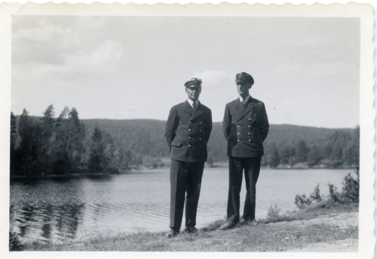 Två män i [tull]uniform framför vattendrag, Harald Sundling till vänster.
