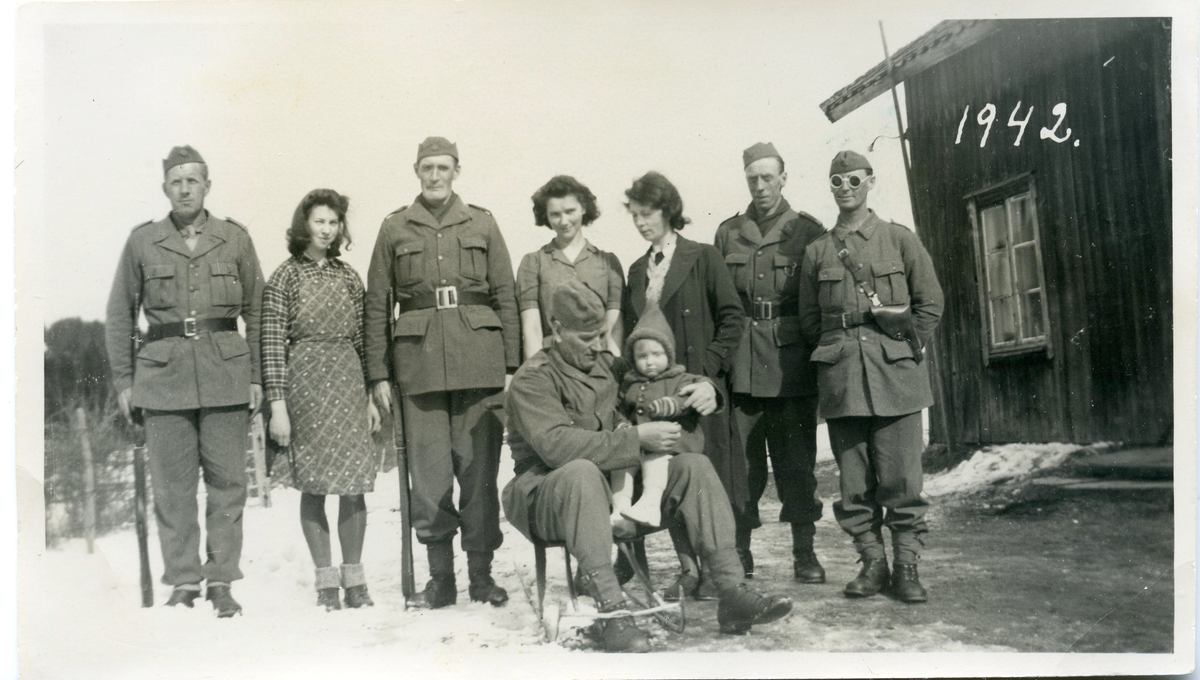 Grupp människor, militärer, kvinnor och barn i Grunnerud. Ingrid Sundling stående nr 3 från vänster.