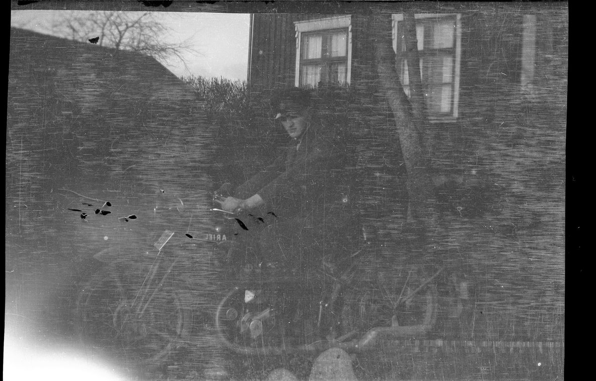 [förmodligen] Harald Sundling på motorcykel framför hus.
