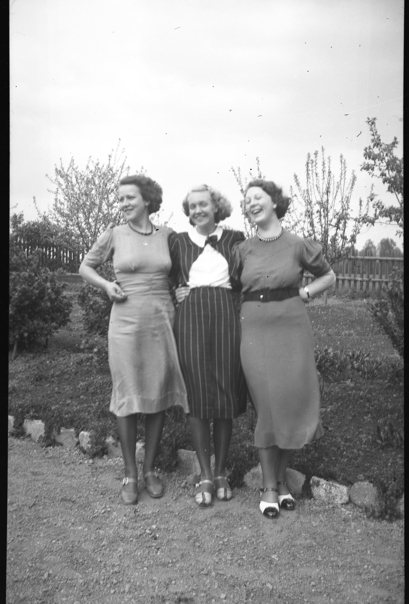 Tre kvinnor poserar framför kameran. Ingrid Sundling till höger.