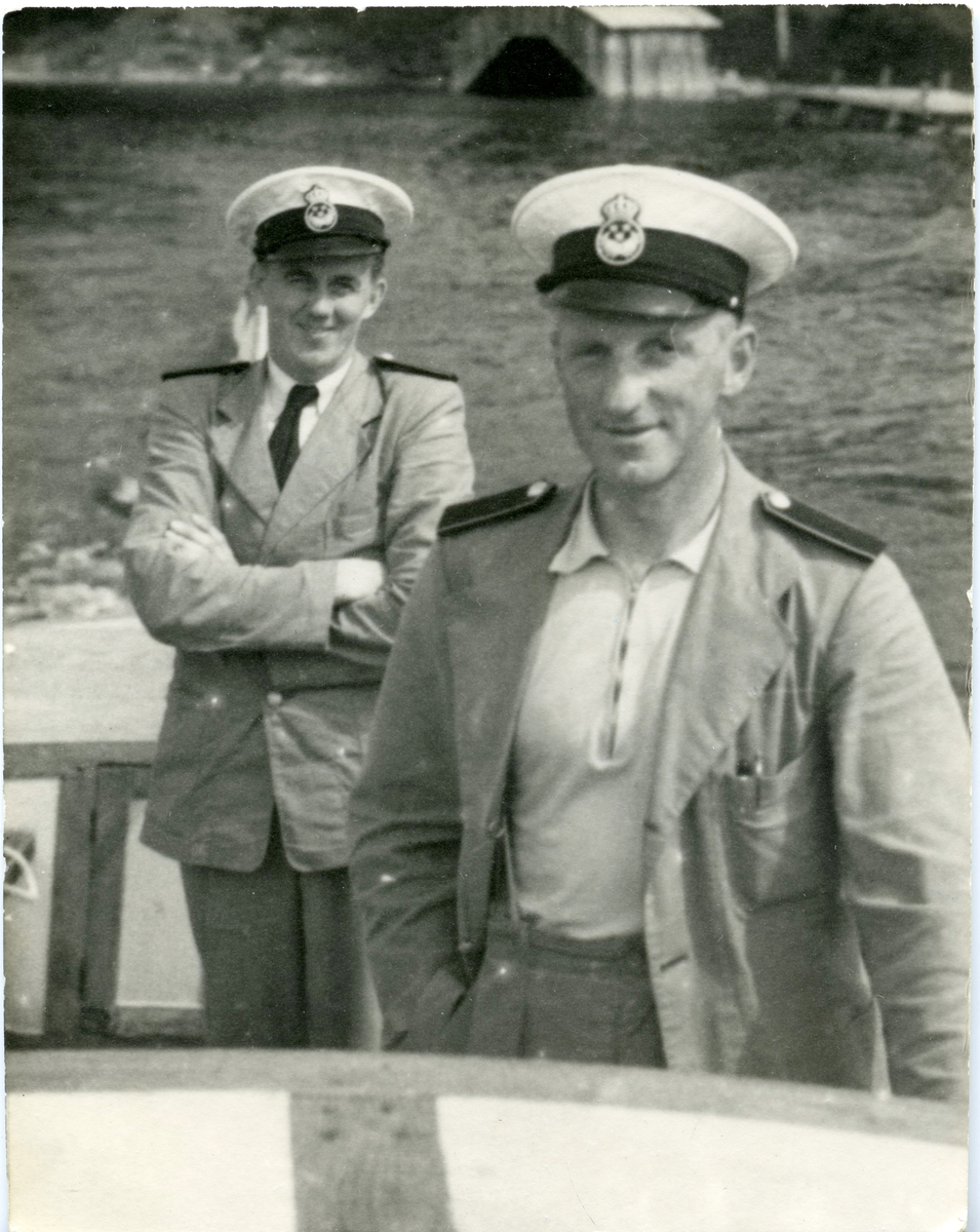 Harald Sundling [till höger] och okänd man iförd tulluniform i båt.