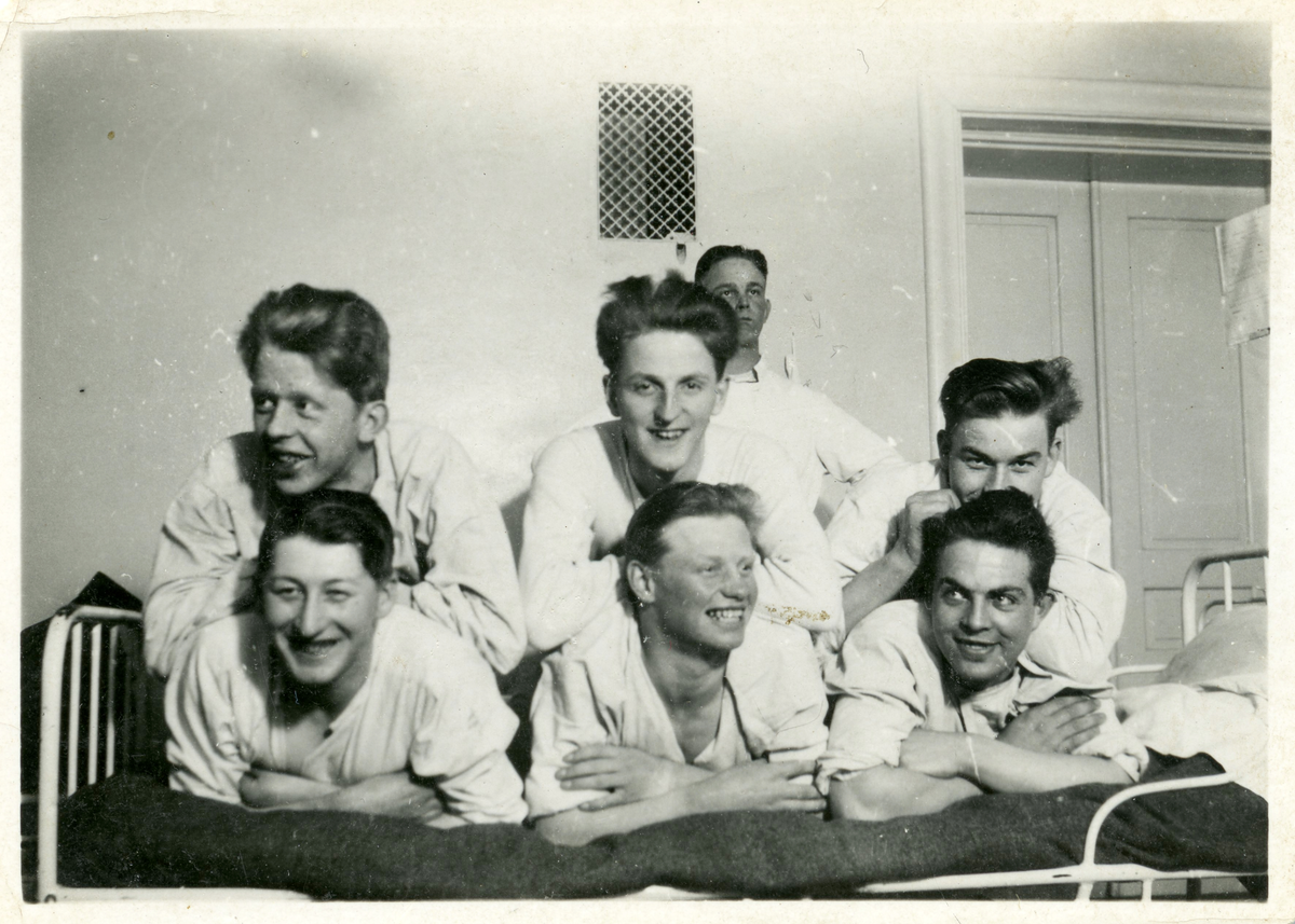 Harald Sundling [övre Raden i mitten] tillsammans med fem andra unga män poserar för kameran, i bakgrunden ytligare en ung man.