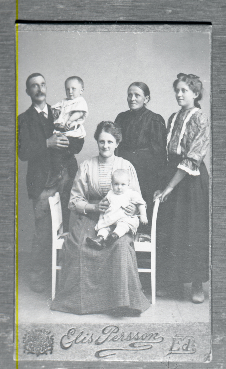Familj, gruppbild. Från vänster: Enok Sundling med sonen Georg, Dagny med sonen Harald, Dagnys mor Karolina och en av Dagnys systrar.