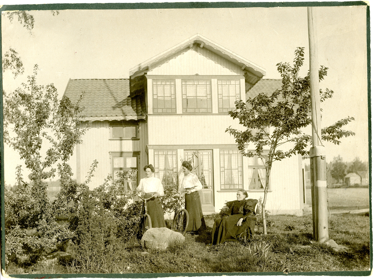 Dagny Sundlings mor Karolina och två systrar i trädgård framför hus.
