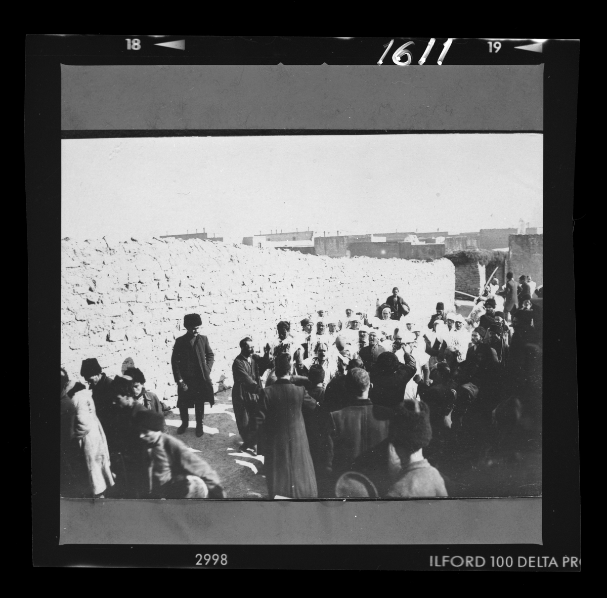 På kuvertet står följande information sammanställd vid museets första genomgång av materialet: Baku. Kisli. Schaksej Vaksehej. Bilden visar en grupp Tatare som huggit sig med Kinschaler så bloder rinner kring deras huvuden och nu omhändertages av kamrater för att förbindas. Efter oroligheterna
