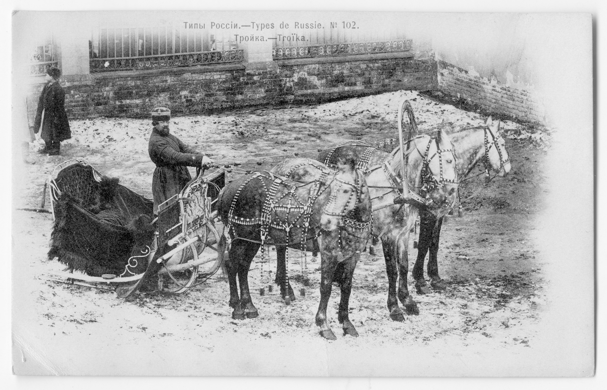 På kuvertet står följande information sammanställd vid museets första genomgång av materialet: Troika, hästar och vagn.