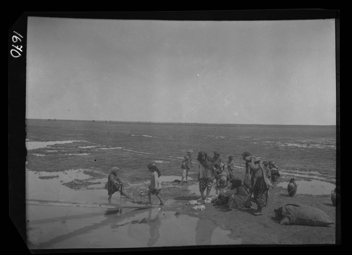 På kuvertet står följande information sammanställd vid museets första genomgång av materialet: Korafloden. Tatarkvinnor som tvättar vid bevattningen.
