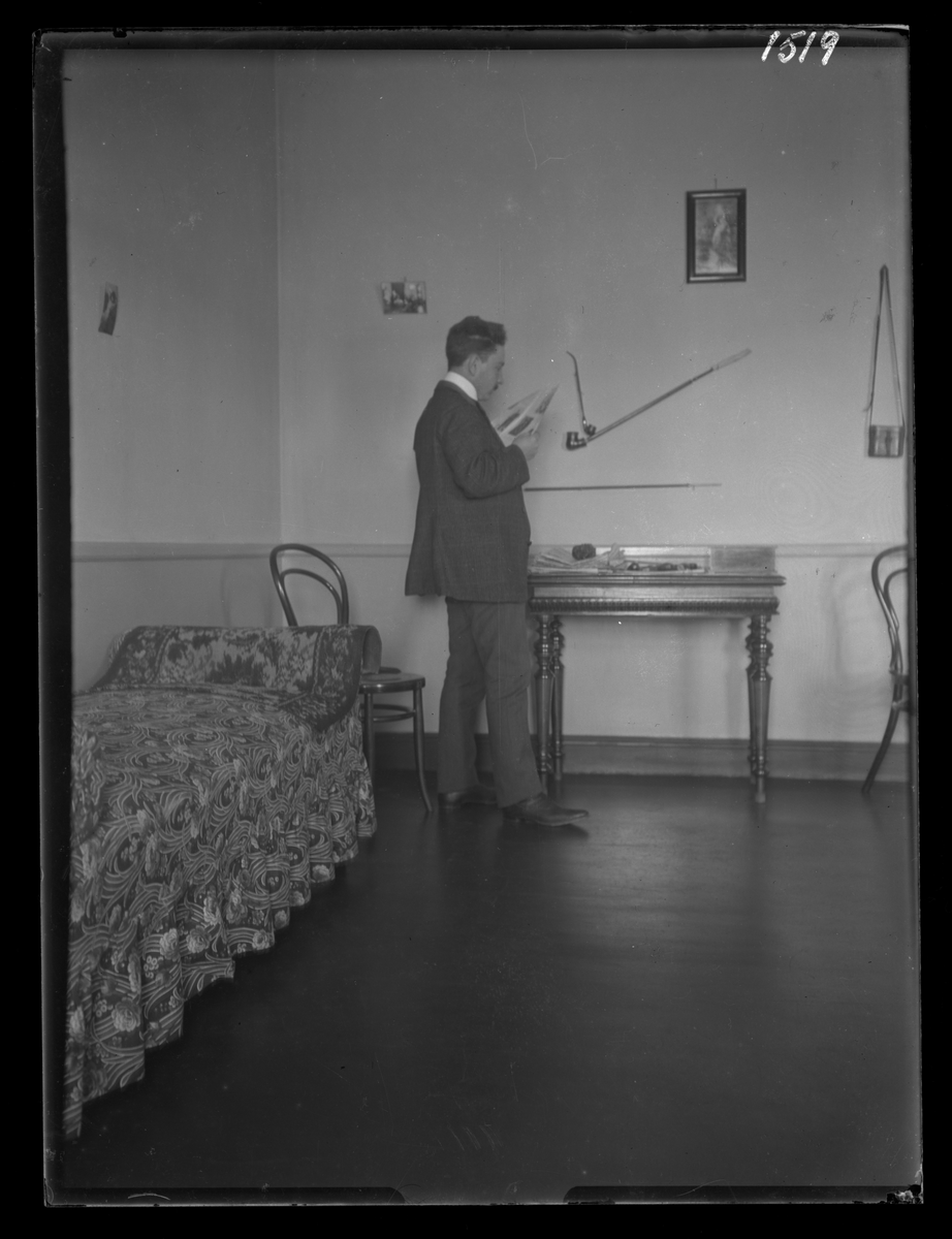 På kuvertet står följande information sammanställd vid museets första genomgång av materialet: Man i möblerat rum.