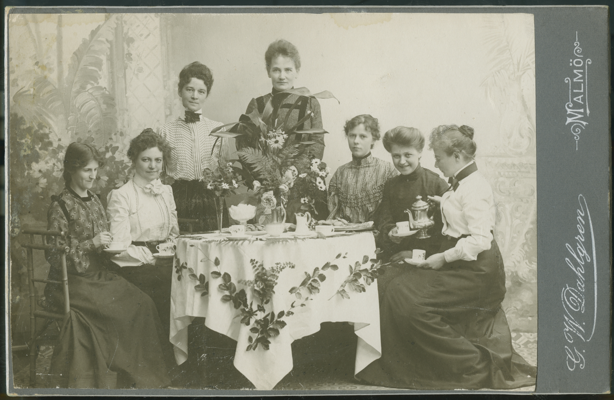 På kuvertet står följande information sammanställd vid museets första genomgång av materialet: Fotograferna firar födelsedag. Porträtt av fotograf Angelina Dahlgren m.fl.