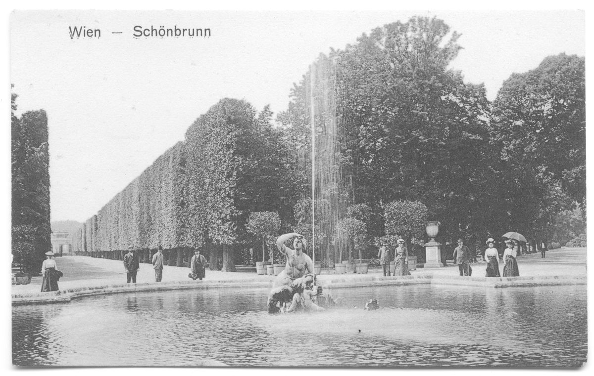 På kuvertet står följande information sammanställd vid museets första genomgång av materialet: Fontän, Schönnbrunn.