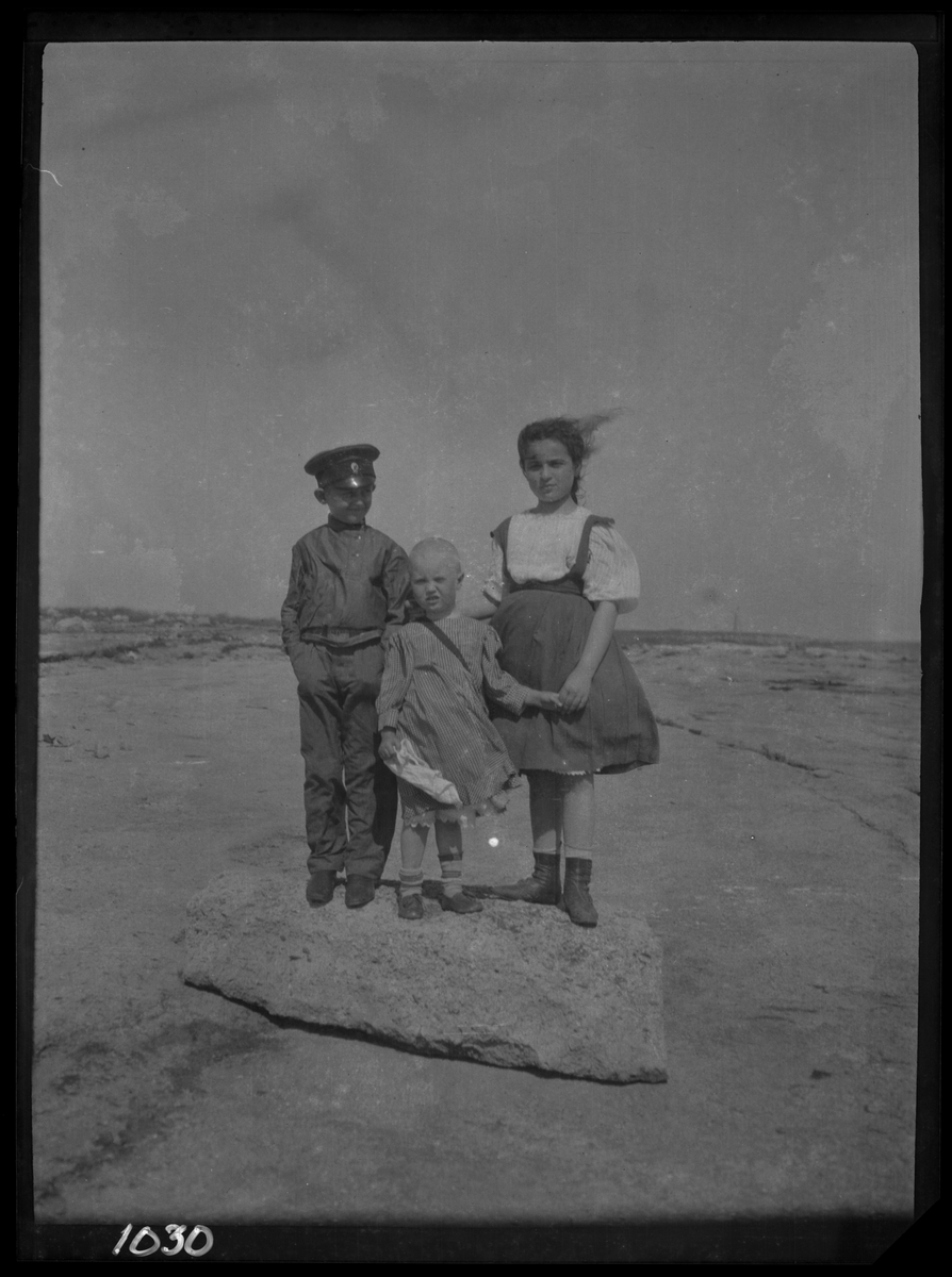 På kuvertet står följande information sammanställd vid museets första genomgång av materialet: gr bild. Barn på sten.