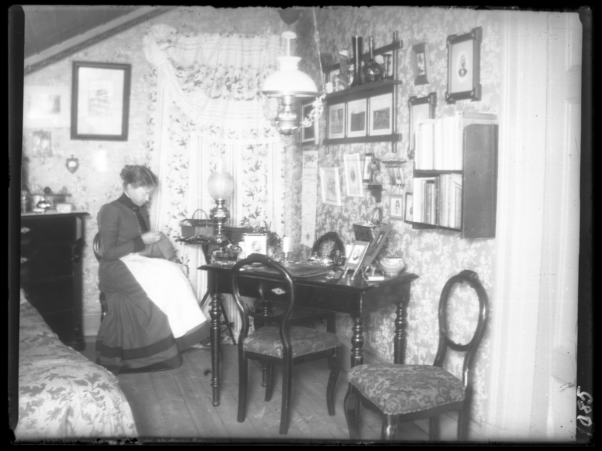 På kuvertet står följande information sammanställd vid museets första genomgång av materialet: Dam sitter och syr. int.