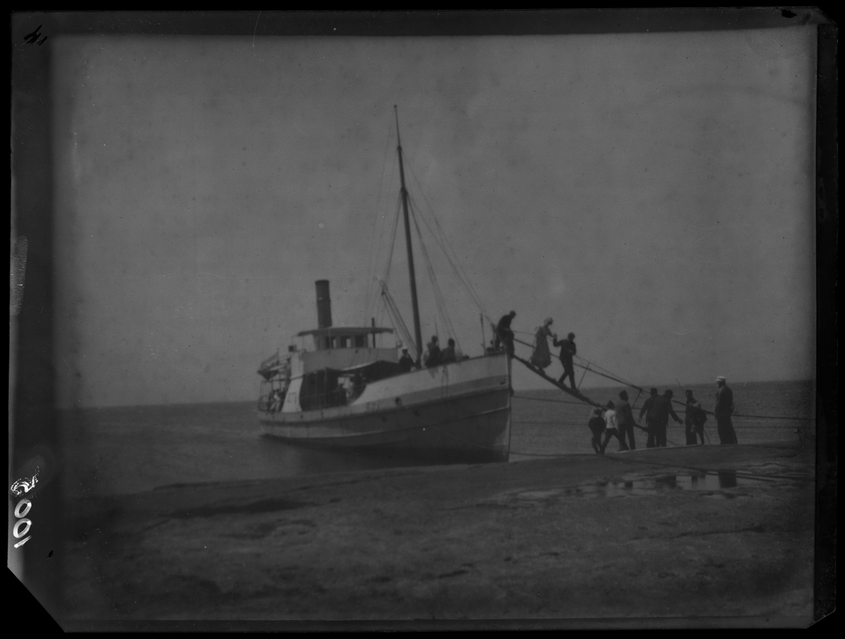 På kuvertet står följande information sammanställd vid museets första genomgång av materialet: Möniskogrupp stiger av en stor båt.