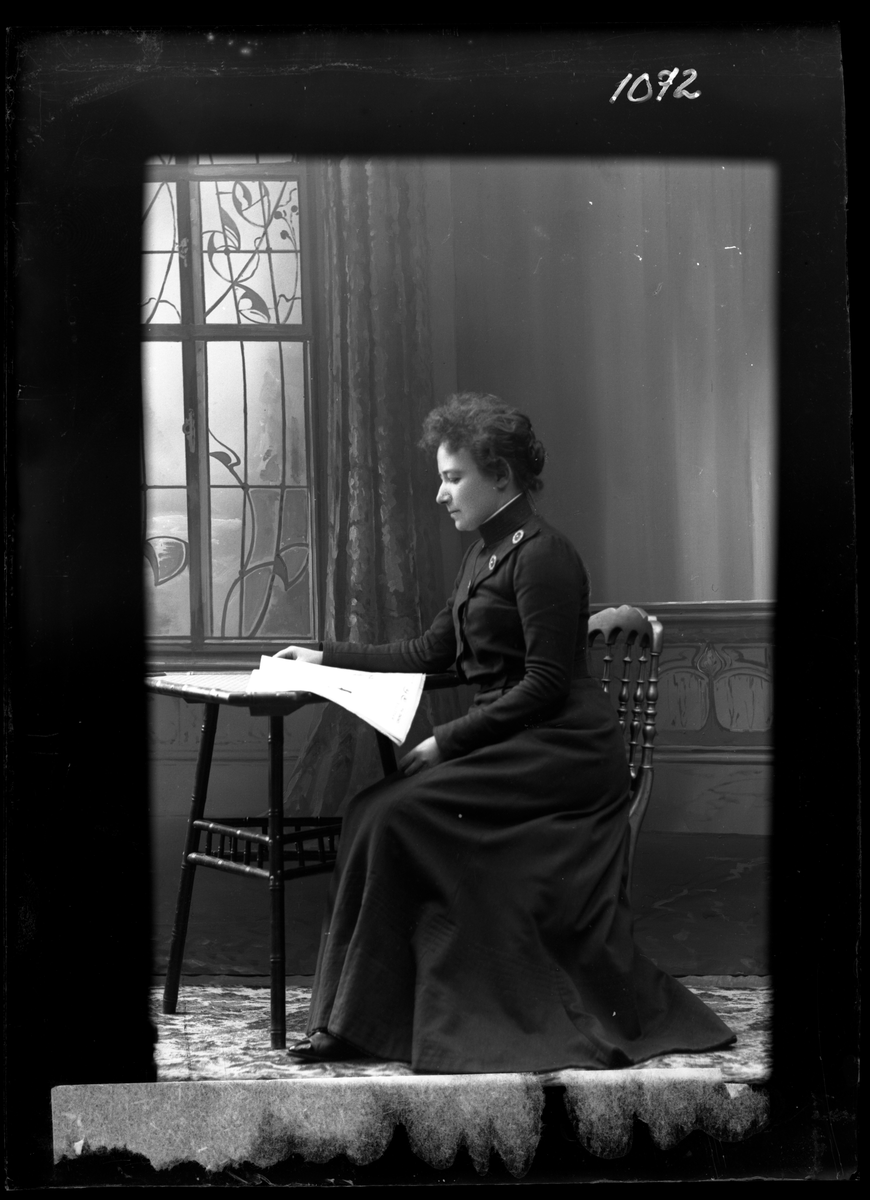 På kuvertet står följande information sammanställd vid museets första genomgång av materialet: Porträtt, Dam.